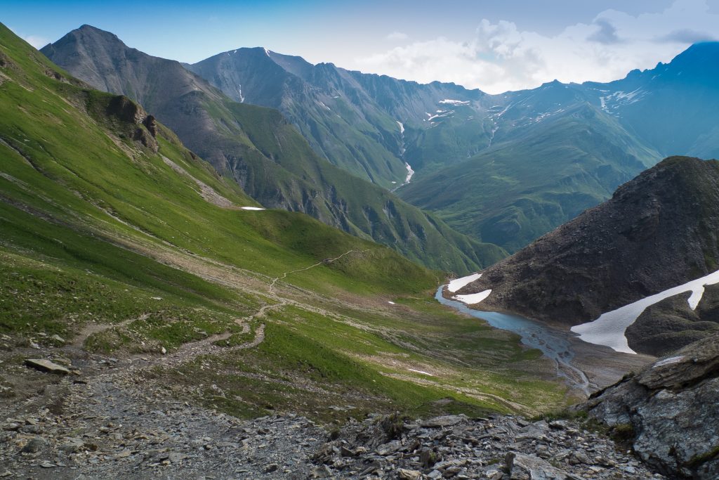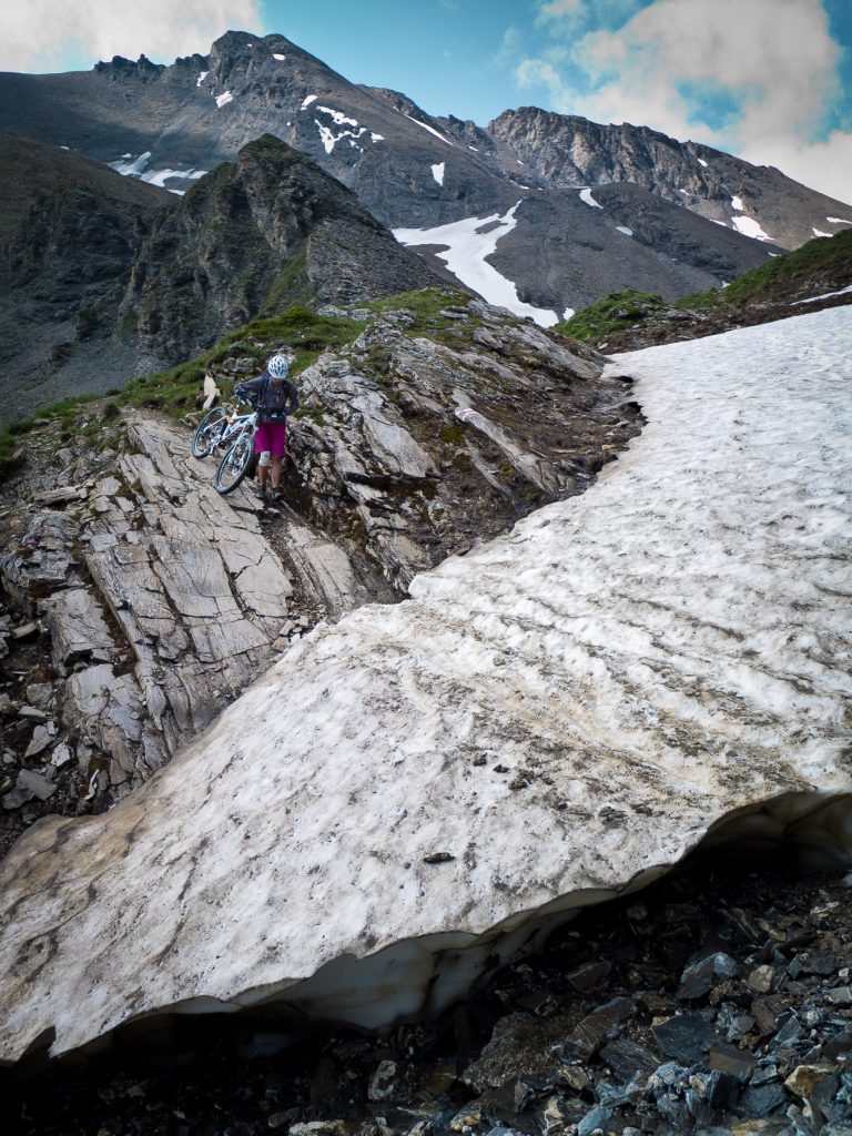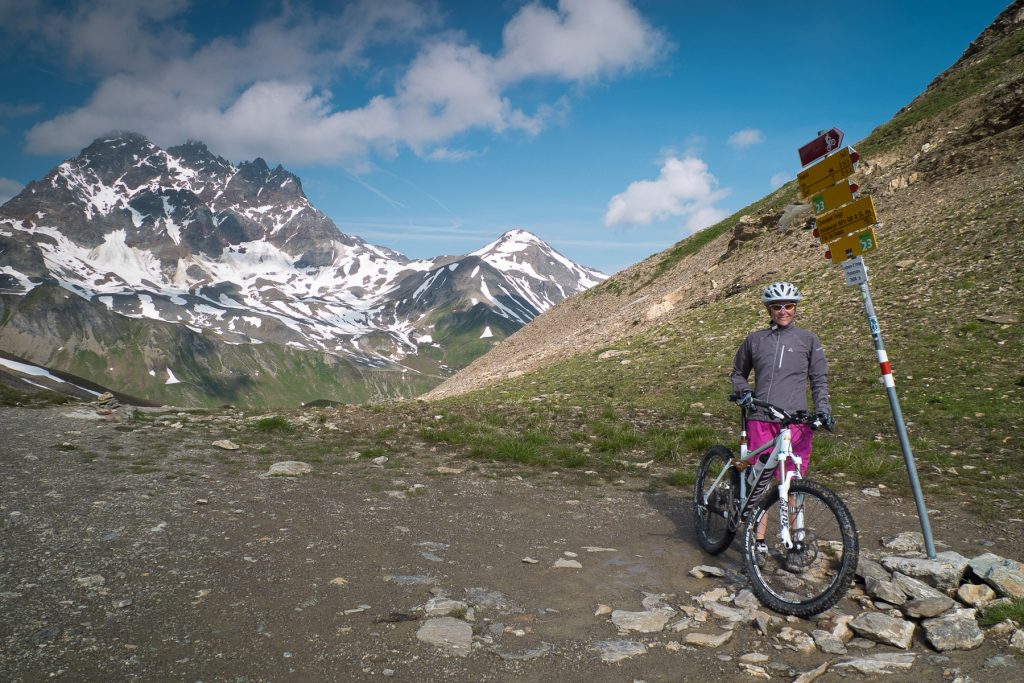 Wir verlassen die Heidelberger frohen Mutes und gelangen bei strahlend schönem Wetter, blauer Himmel inklusive, zur Tragepassage, die hinauf zum Fimberpass führt. Oben angekommen gibt es gleich mal ein kleines Fotoshooting, weil Panorama und Sonne und grandiose Kurve und überhaupt.