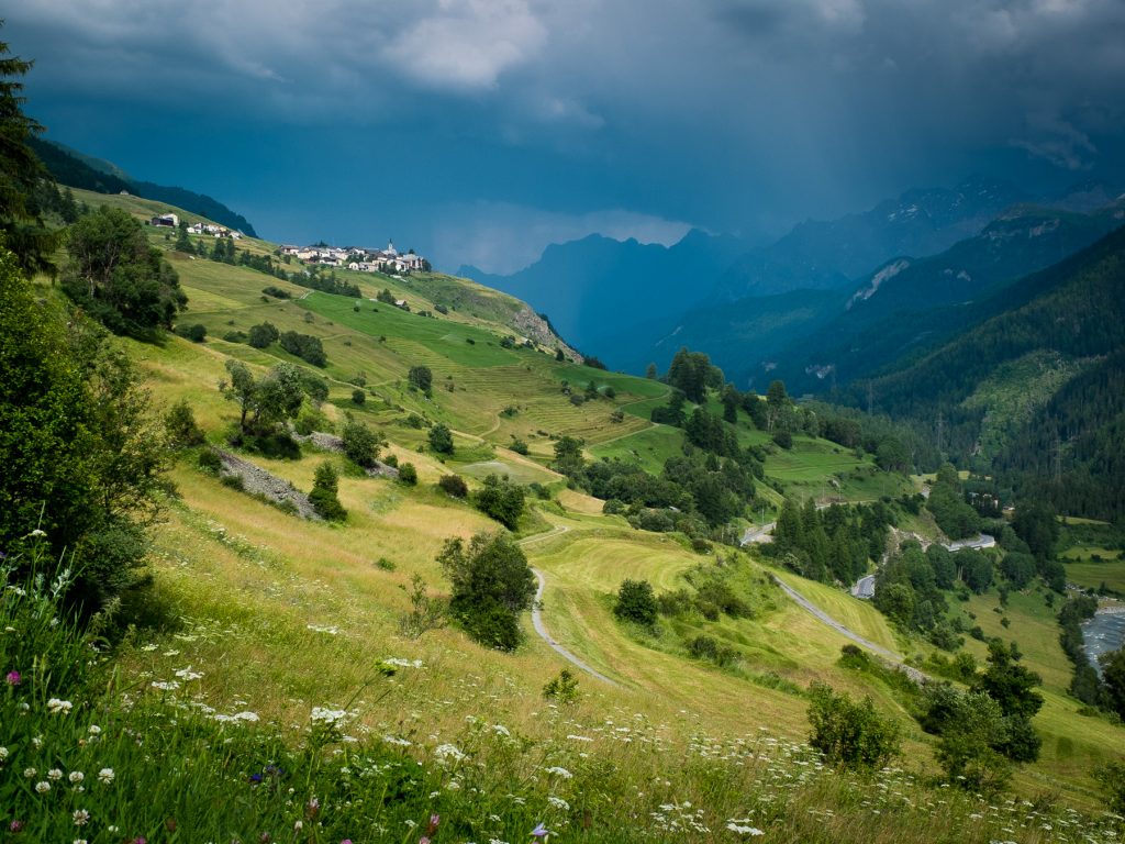 Weiter gehts´ über lustige Wanderwege, Hängebrücken, Steinbrücken,… nach Scuol, wo erstmals Pasta gefuttert wird, die aber gleich wieder verpufft, als wir uns, bei extrem schwülen Wetterverhältnissen, den nächsten Berg hinaufschieben. Wie gestern, sitzt uns eine violettfarbene Gewitterfront im Nacken, doch donner- und blitzerprobt wie wir nun sind, lässt uns diese kalt, vor allem als wir die nächsten Ortschaften erreichen.