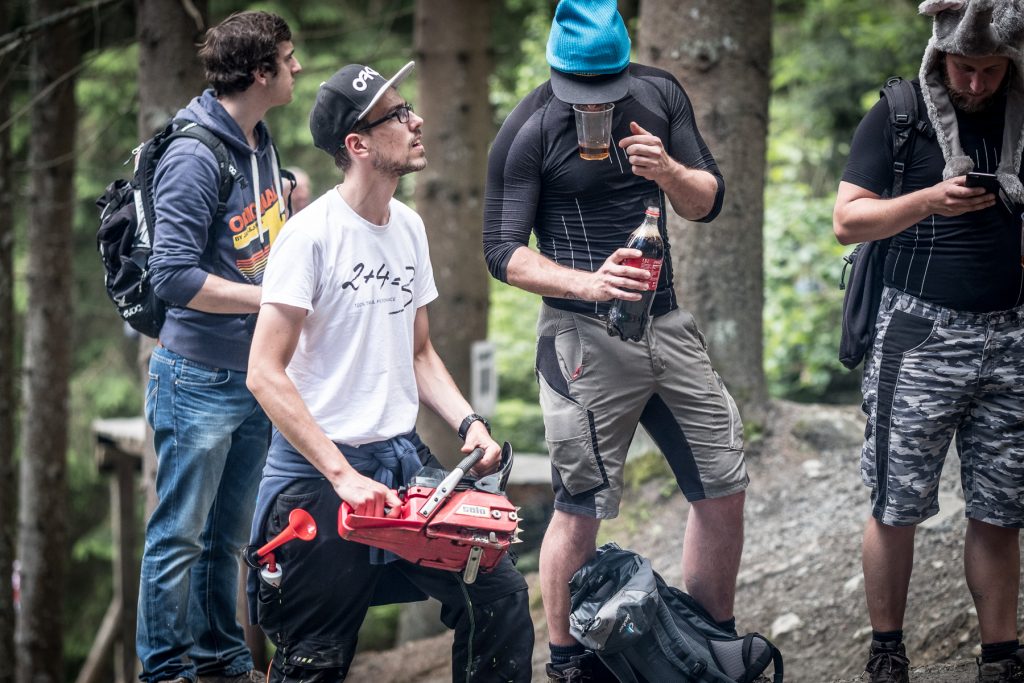 Dies motiviert nicht nur die Downhiller Männlein und Weiblein, sondern auch den ein oder anderen Zuschauer. So werden bald getunte Motorsägen, Felgen und andere zweckentfremdete Gerätschaften laut.